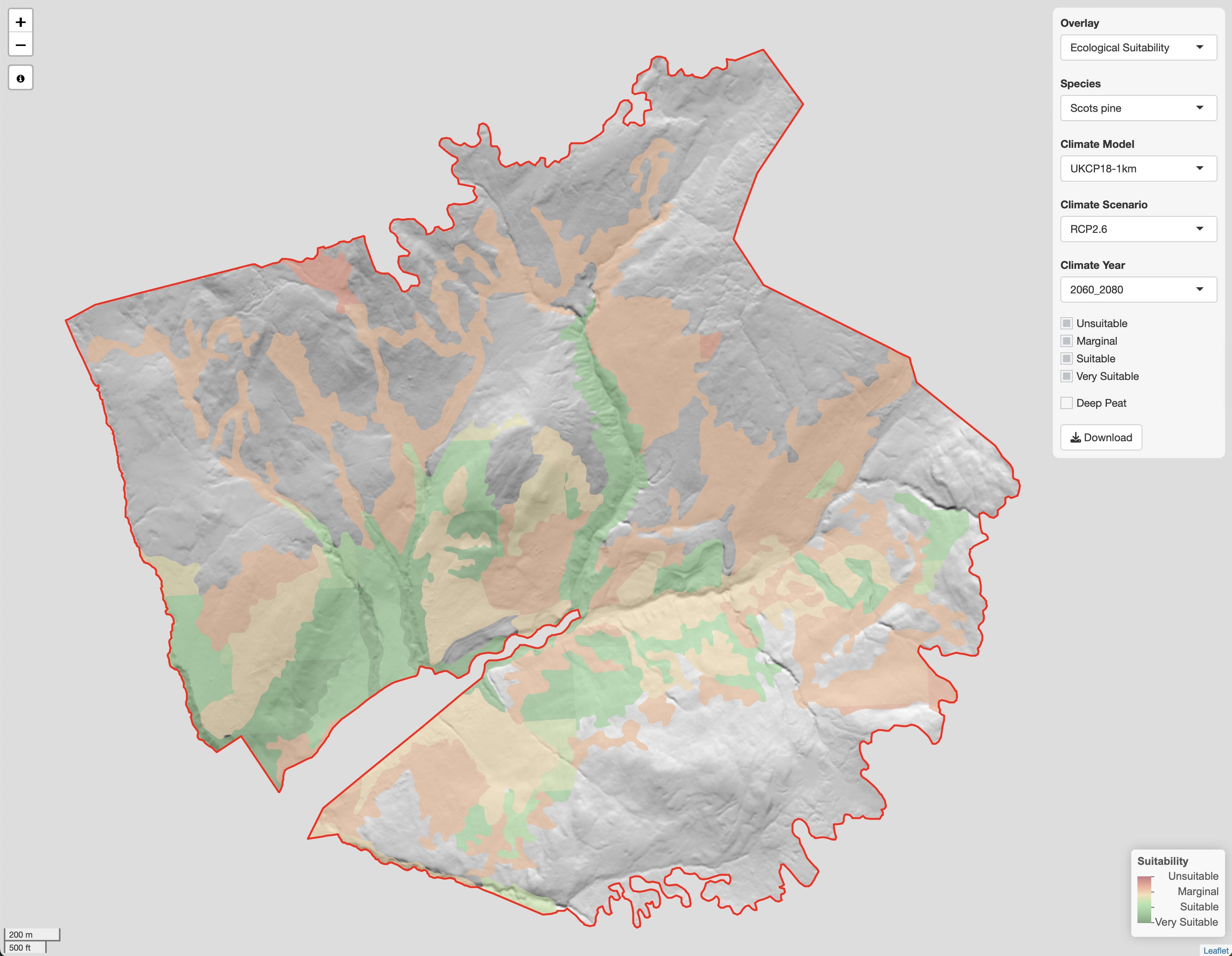 I have created an interactive map tool for comprehensive Ecological Site Classification (ESC) woodland suitability assessments. Detailed maps are created from your site-specific soil and/or habitat surveys, offering a spatially rich alternative to point observations. A custom web map provides an intuitive platform to assess suitability variation across a site under different future climate scenarios, helping match species to site conditions. Reach out for access to a demo.